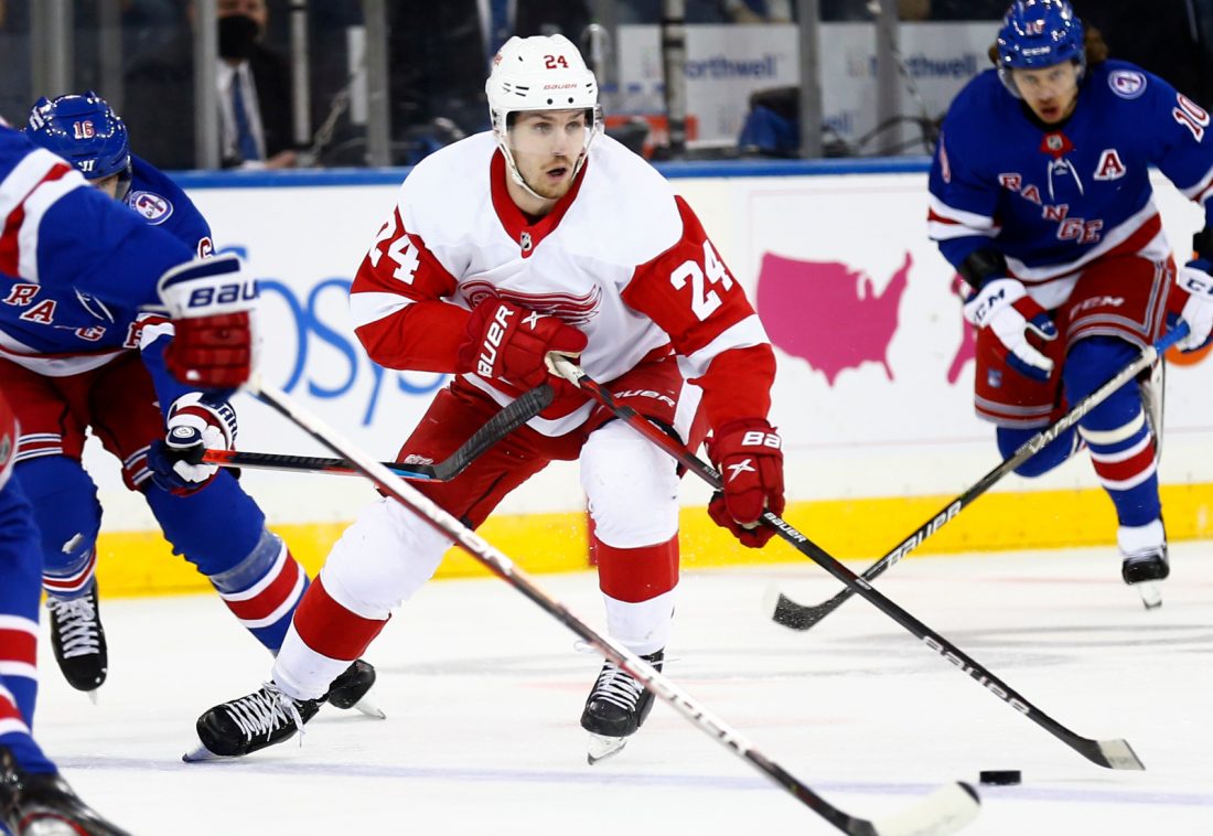 AP photo Detroit Red Wings’ Pius Suter (24) skates up the ice against the New York Rangers on Thursday in New York.