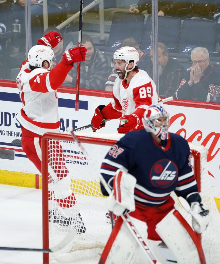 AP photo Detroit Red Wings’ Dylan Larkin (71) and Sam Gagner (89) celebrate Gagner’s goal against Winnipeg Jets goaltender Connor Hellebuyck (37) Wednesday in Winnipeg, Manitoba.