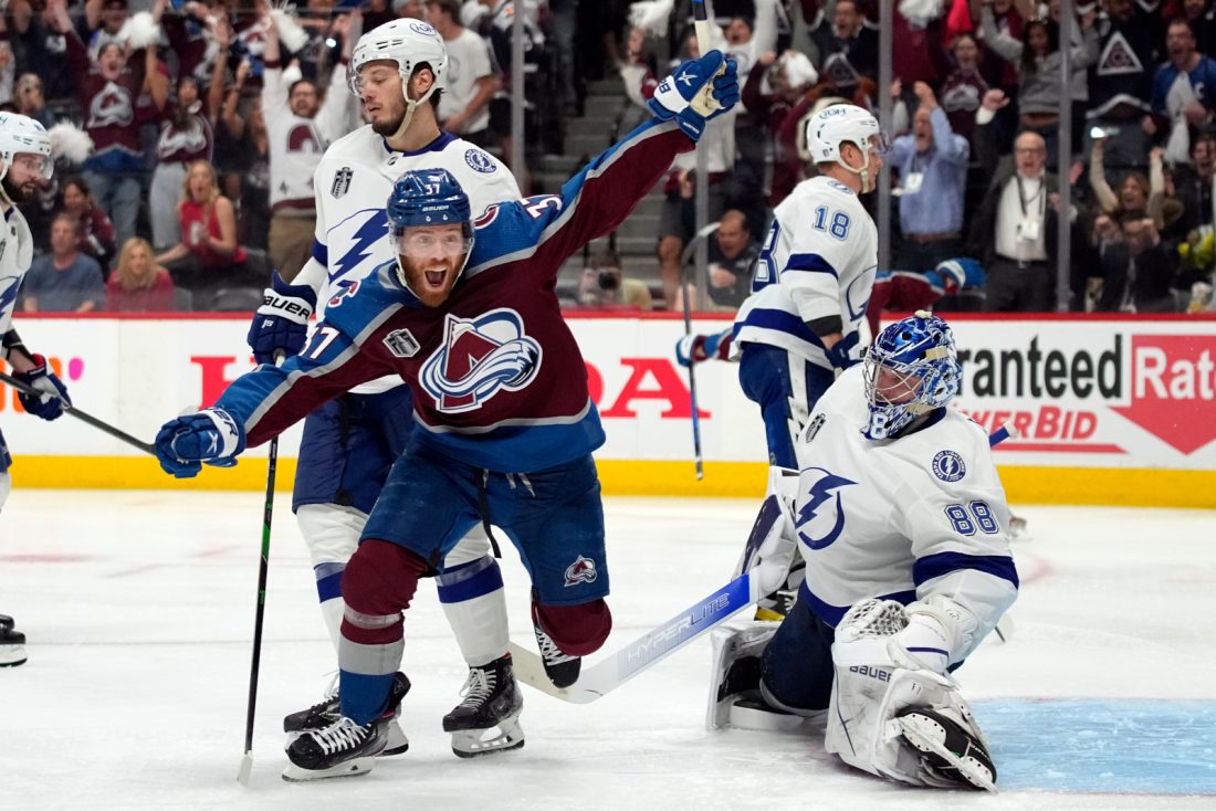 Tampa Bay’s latest additions also played a major role, with Nick Paul outracing Colorado defenseman Jack Johnson to a loose puck for a goal in the first that limited the damage and kept the defending champs in the game. Brandon Hagel, who has been banged up and was a question mark to play, got beaten to a loose puck by Landeskog, an uncharacteristic goal for reigning playoff MVP Andrei Vasilevskiy to give up by letting the initial shot sneak through under his left arm.