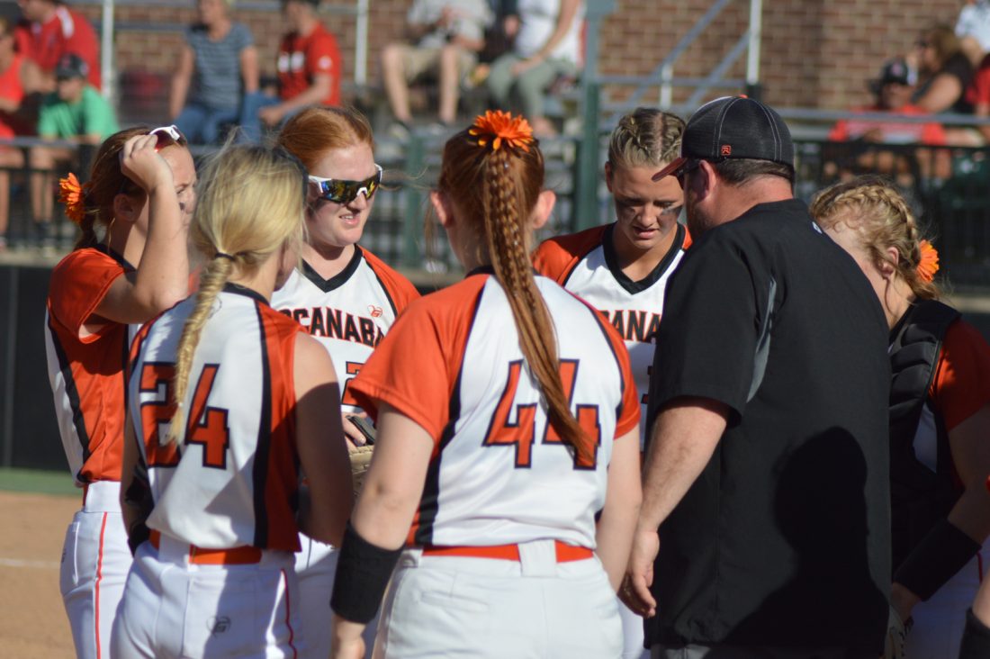 Todd Rose | Daily Press Escanaba softball coach Andy Fields (right) talks to his team during an MHSAA Division 2 State Semifinal against Stevensville Lakeshore in East Lansing Thursday.