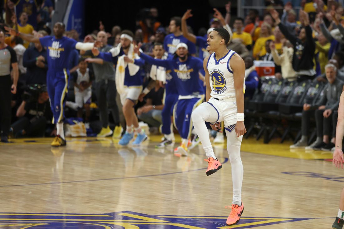 AP photo Golden State Warriors guard Jordan Poole (3) celebrates after scoring against the Boston Celtics during Game 2 of basketball’s NBA Finals in San Francisco, Sunday.