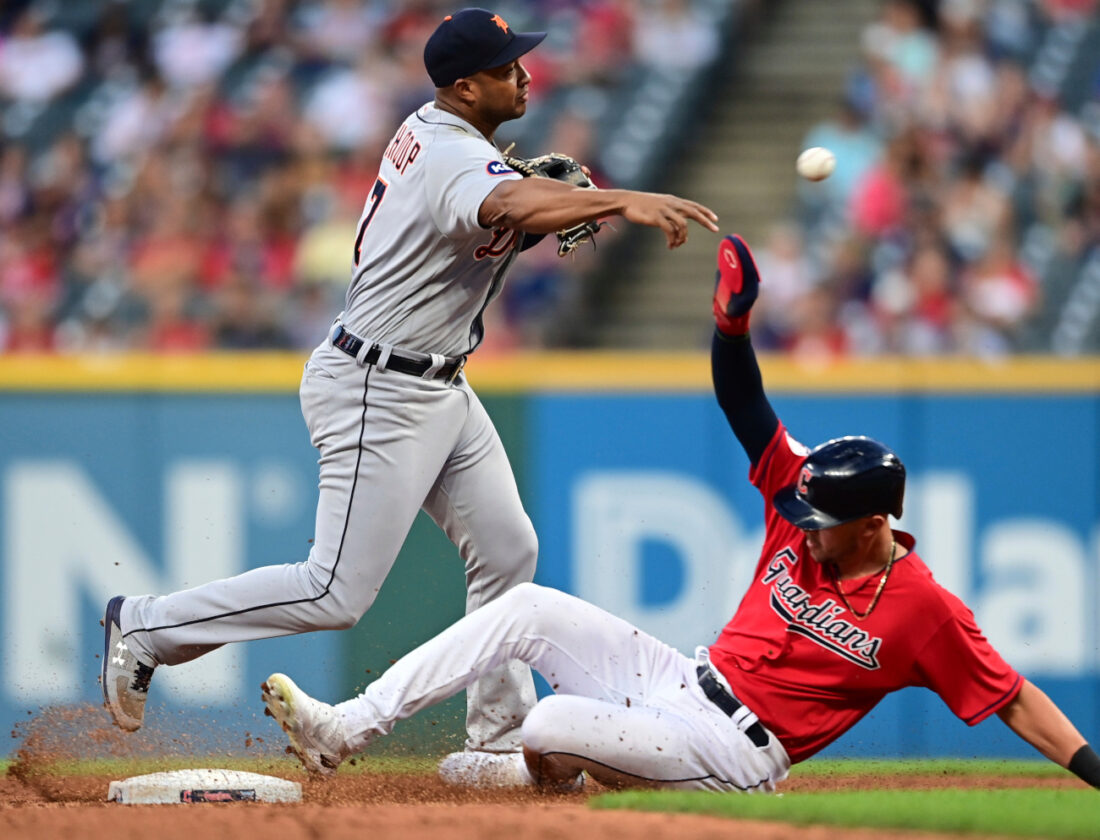 AP photo Detroit Tigers second baseman Jonathan Schoop throws to fist after forcing out Cleveland Guardians’ Nolan Jones at second base Thursday, in Cleveland.