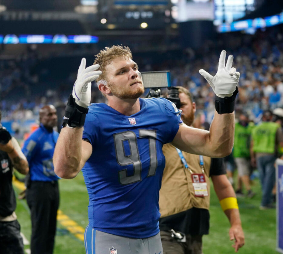 AP photo Detroit Lions defensive end Aidan Hutchinson (97) celebrates after a win against the Washington Commanders Sunday in Detroit.