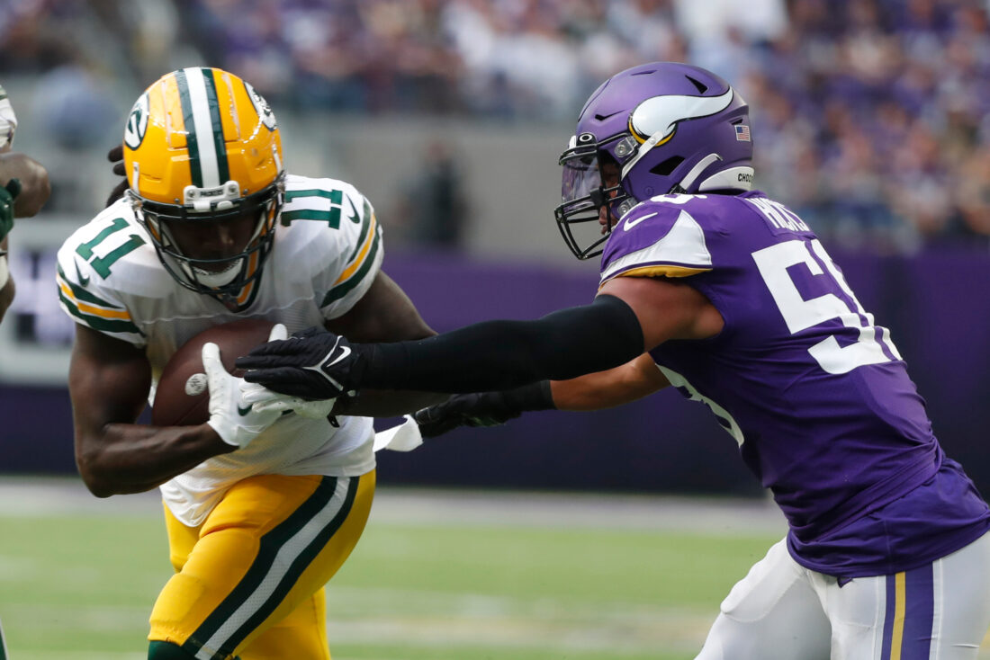AP photo Green Bay Packers wide receiver Sammy Watkins (11) runs from Minnesota Vikings linebacker Jordan Hicks (58) after catching a pass, Sunday, in Minneapolis.