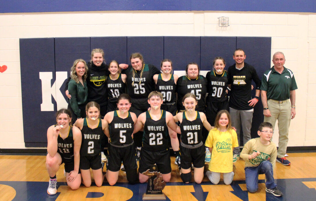 The 2023-24 Carney-Nadeau girls’ basketball team poses for a photo with its district championship medals and trophy on March 8, 2024 at Norway High School. The Wolves defeated the Knights 53-46 for their fourth district title in the last five seasons. (Adam Hinch/Daily Press)