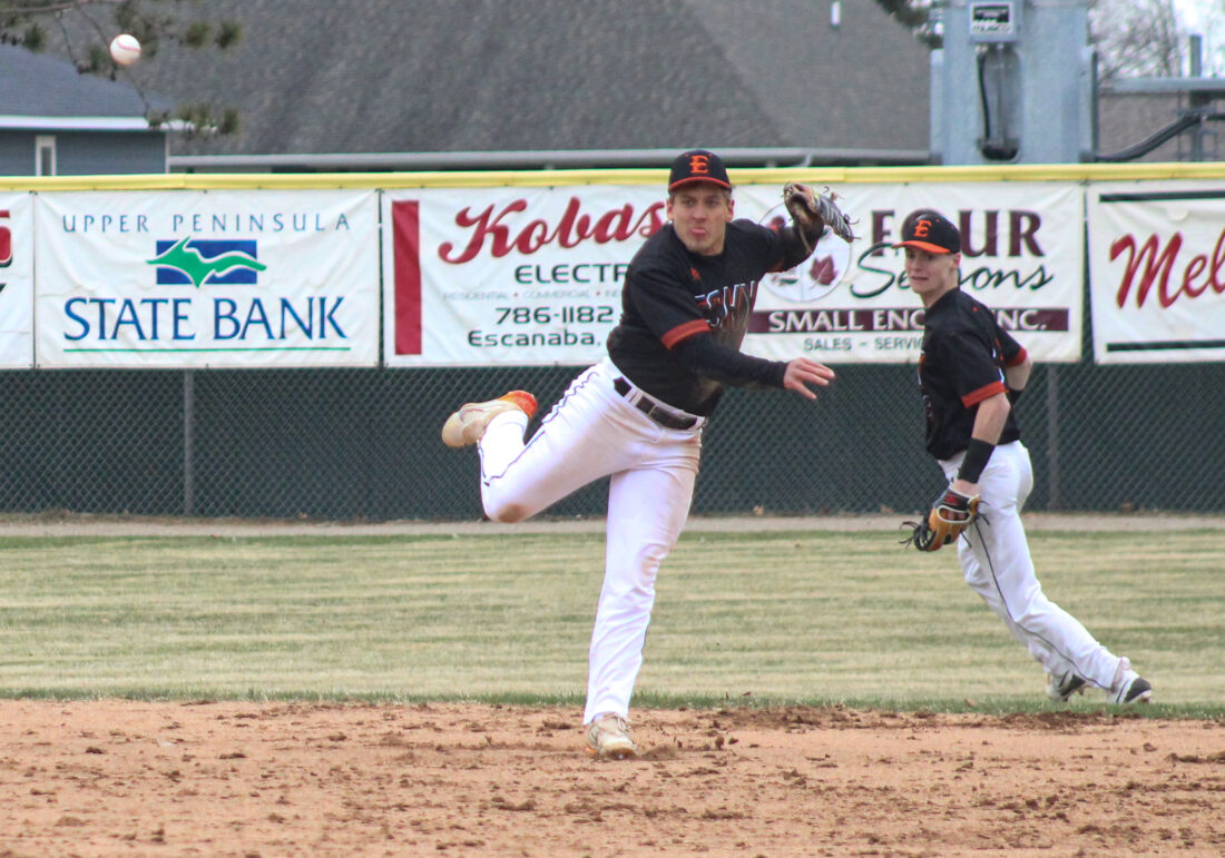 Escanaba senior Eli Gardner makes a throw to first base during a game against Gladstone on April 19, 2024 at Al Ness Field. (“The Big Dog” Mitch Vosburg/Daily Press)