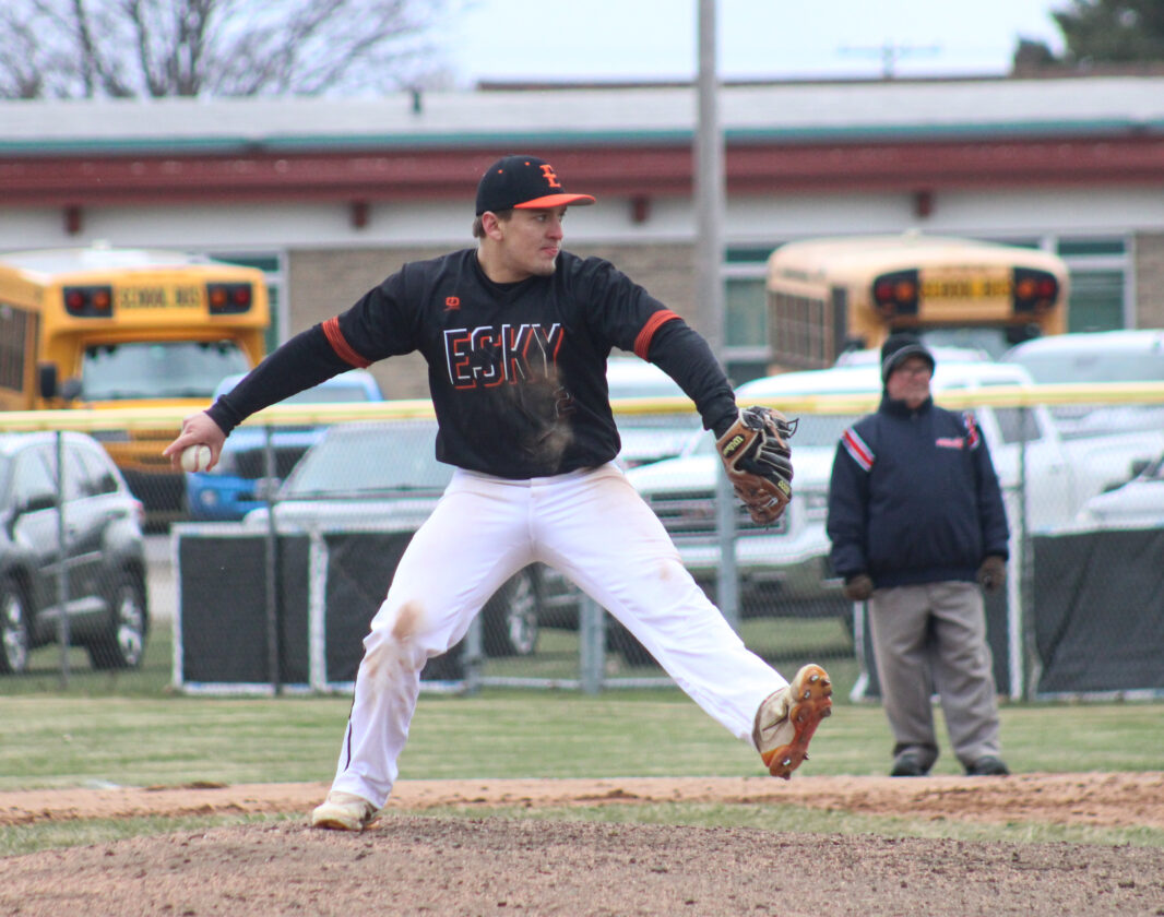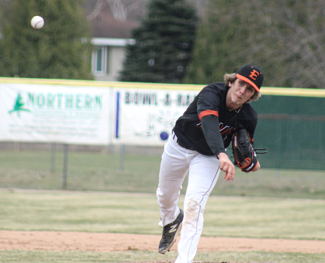 Escanaba senior Ben Johnson fires a pitch during a game against Gladstone on April 19, 2024 at Al Ness Field. (“The Big Dog” Mitch Vosburg/Daily Press)
