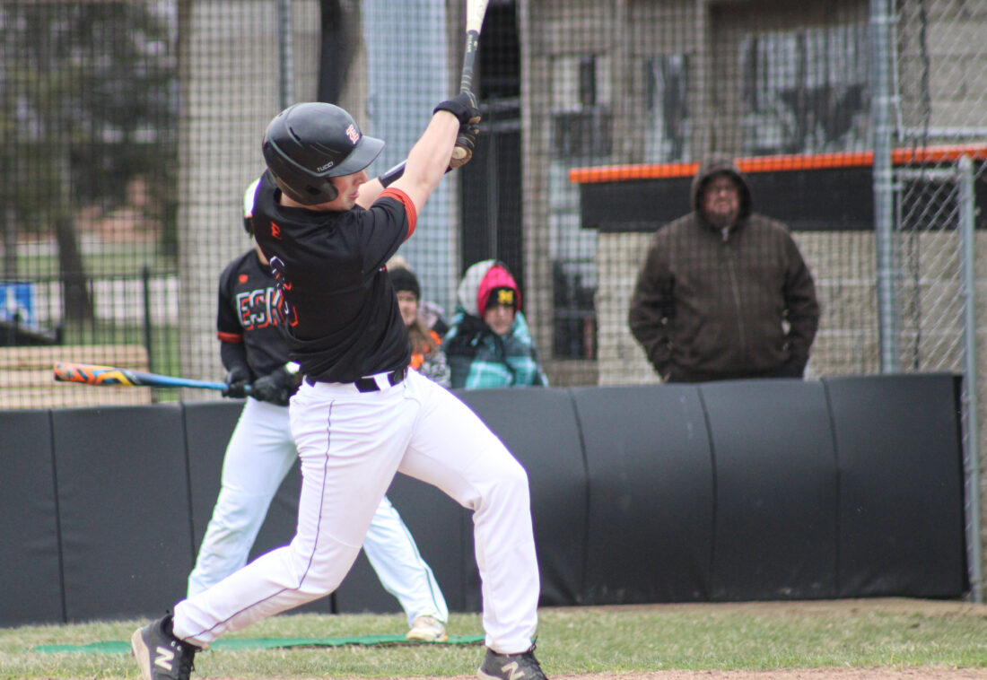 Escanaba senior swings at a pitch during a game against Gladstone on April 19, 2024 at Al Ness Field. (“The Big Dog” Mitch Vosburg/Daily Press)