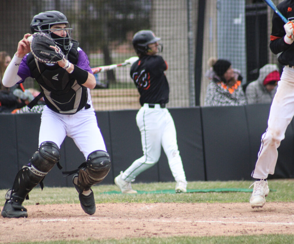Escanaba senior Chase Cloutier fouls off a pitch during a game against Gladstone on April 19, 2024 at Al Ness Field. (“The Big Dog” Mitch Vosburg/Daily Press)