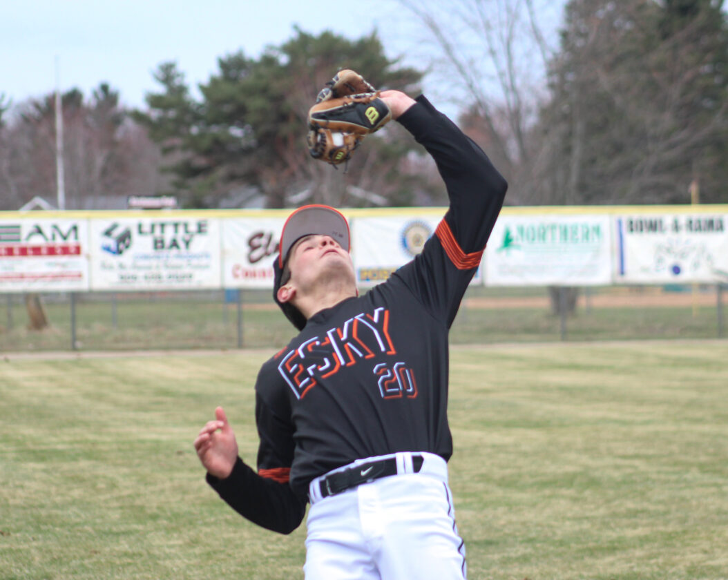 Escanaba third baseman Cannon Arnt secures a fly ball out during a game against Gladstone on April 19, 2024 at Al Ness Field. (“The Big Dog” Mitch Vosburg/Daily Press)