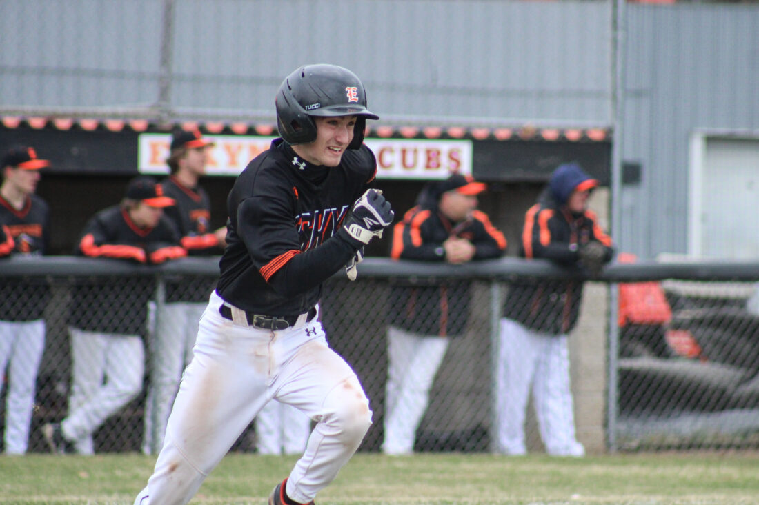 Escanaba senior Chase Cloutier motors down to first base during a game against Gladstone on April 19, 2024 at Al Ness Field. (“The Big Dog” Mitch Vosburg/Daily Press)