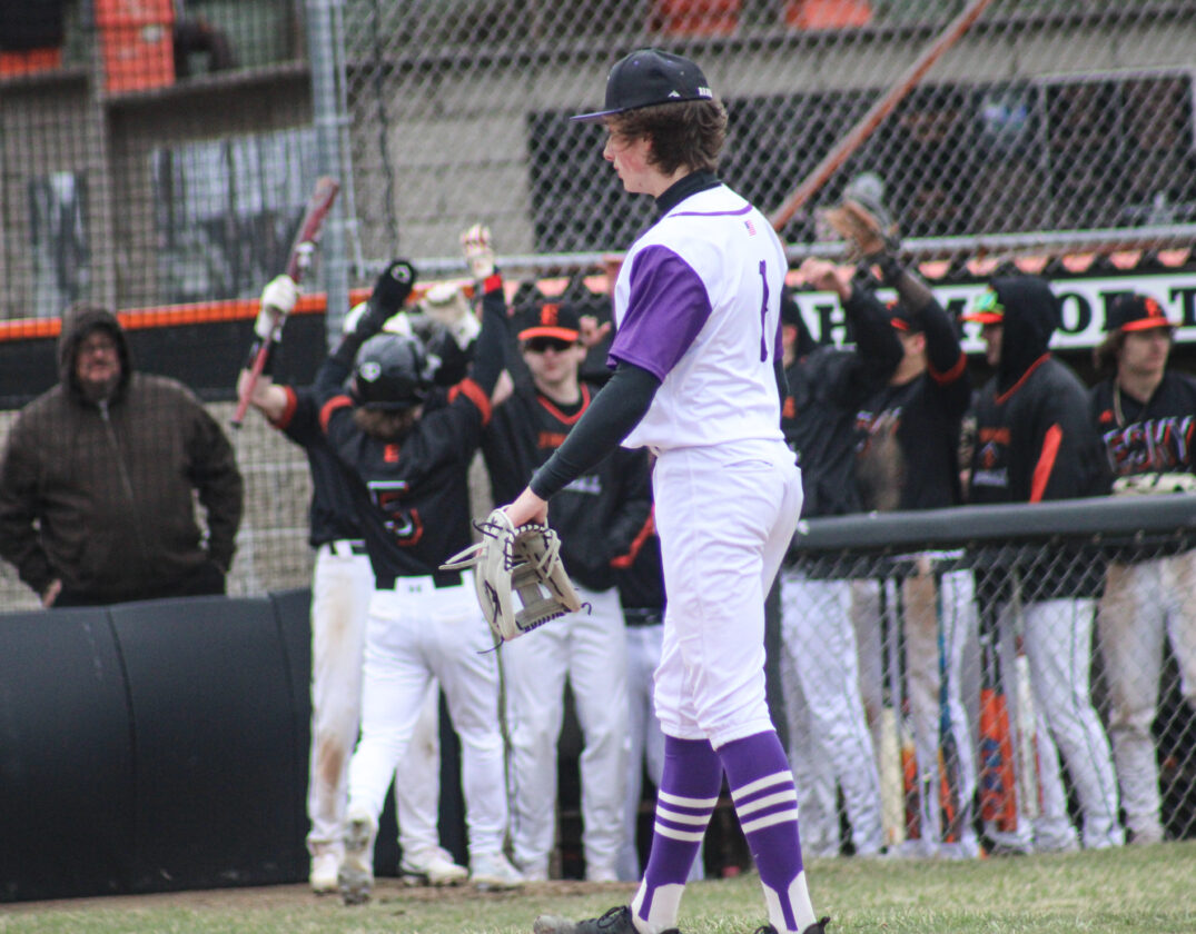 Gladstone pitcher Cooper Sanville (1) waits to receive the ball after hurling a wild pitch which scored a run during a game against Escanaba on April 19, 2024 at Al Ness Field. (“The Big Dog” Mitch Vosburg/Daily Press)