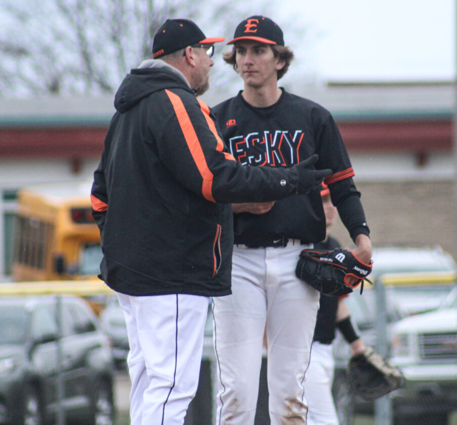 Escanaba coach Scott Hanson (left) chats with sophomore Lennox Peacock during a game against Gladstone on April 19, 2024 at Al Ness Field. (“The Big Dog” Mitch Vosburg/Daily Press)