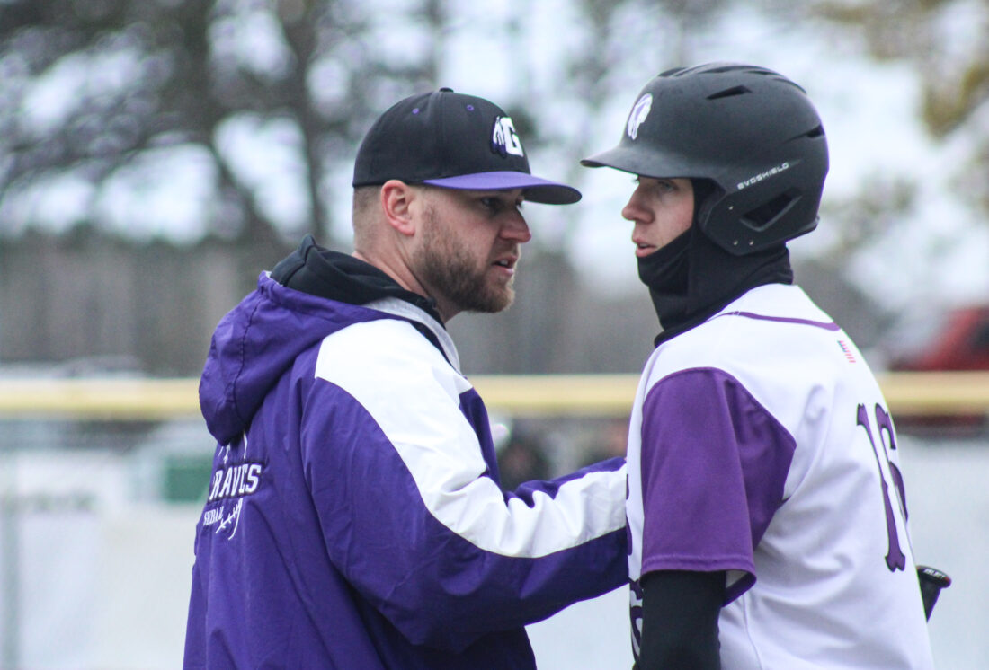 Gladstone coach Tyler Swanson (left) has a brief chat with senior John Soderman during a game against Escanaba on April 19, 2024 at Al Ness Field. (“The Big Dog” Mitch Vosburg/Daily Press)