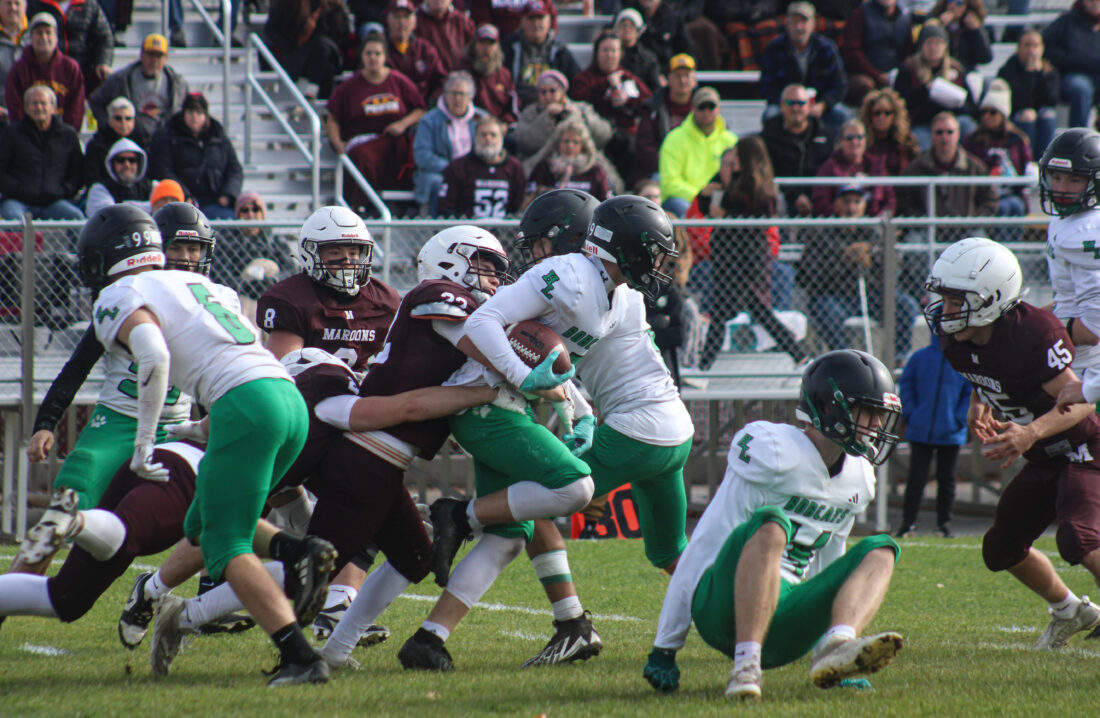 Menominee junior Nathan Komp (2) attempts to shed tacklers during a MHSAA Division 7 district semifinal game against Houghton Lake on Nov. 2, 2024 at Walton Blesch Field in Menominee. (“The Big Dog” Mitch Vosburg/Daily Press)