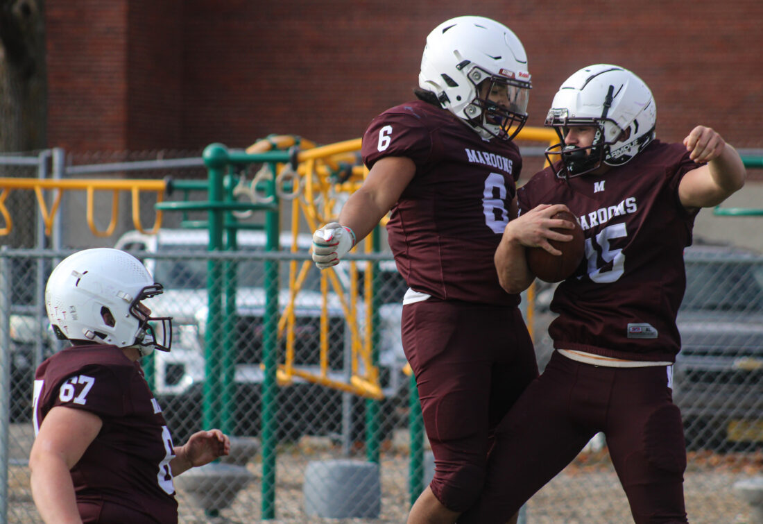Menominee junior Clayton Miller (15) and senior Kaiden Bell (6) celebrate a touchdown during a MHSAA Division 7 district semifinal game against Houghton Lake on Nov. 2, 2024 at Walton Blesch Field in Menominee. (“The Big Dog” Mitch Vosburg/Daily Press)