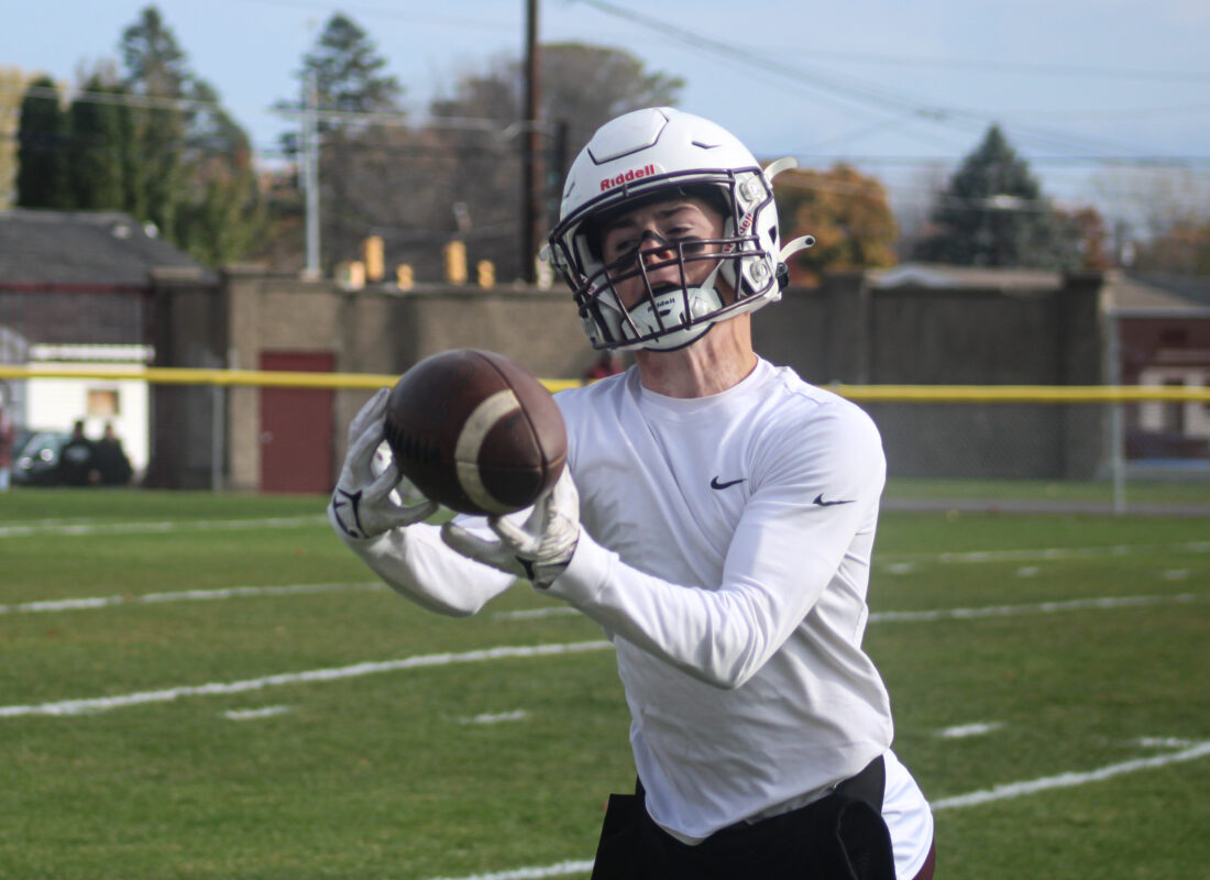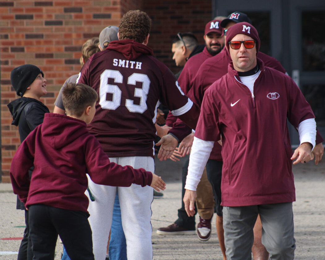 Menominee junior junior Cole Cooper (88) high fives a young fan during a MHSAA Division 7 district semifinal game against Houghton Lake on Nov. 2, 2024 at Walton Blesch Field in Menominee. (“The Big Dog” Mitch Vosburg/Daily Press)