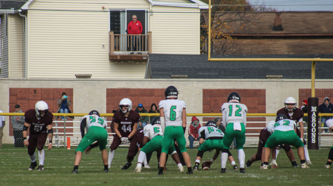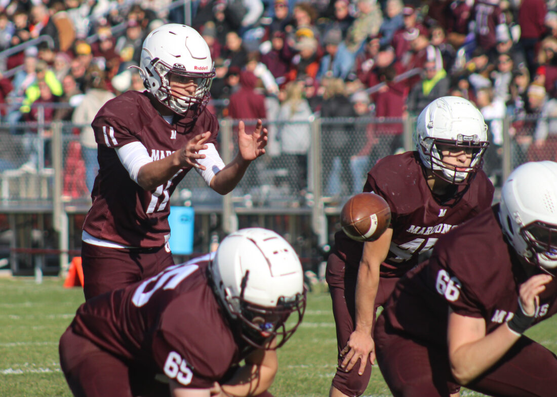 Menominee sophomore Dylan Beal (11) recieves a snap during a MHSAA Division 7 district semifinal game against Houghton Lake on Nov. 2, 2024 at Walton Blesch Field in Menominee. (“The Big Dog” Mitch Vosburg/Daily Press)