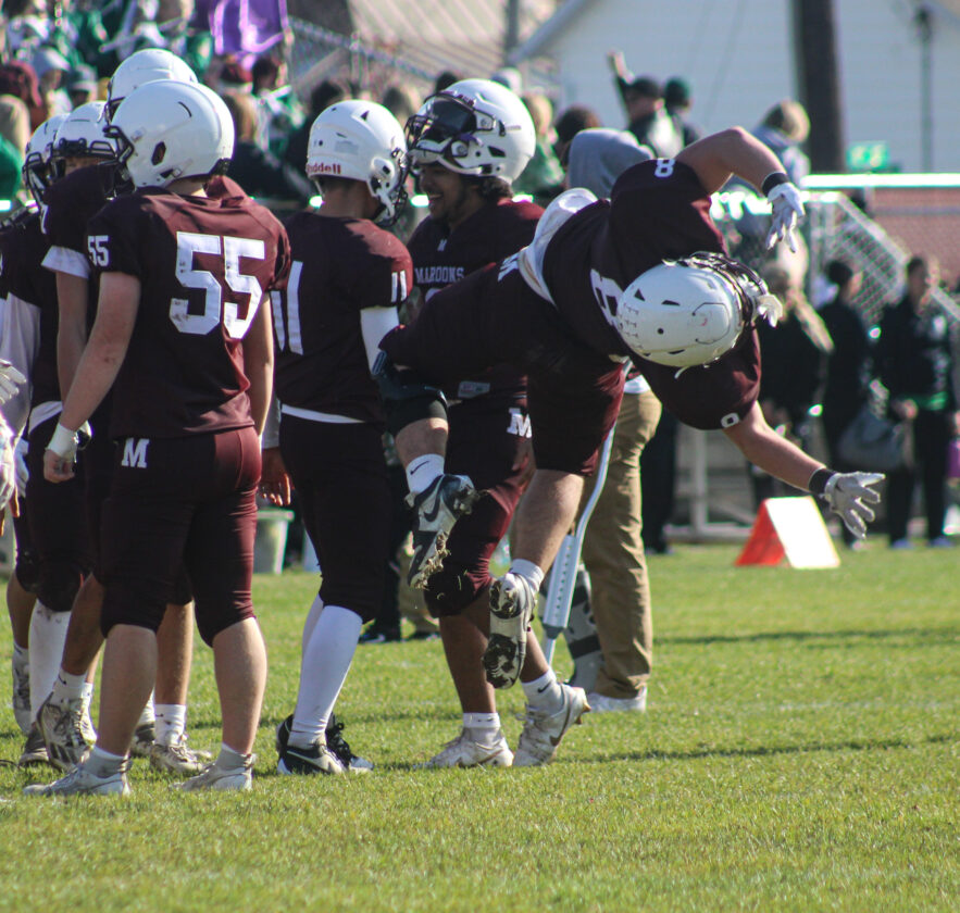 Menominee senior Isaiah Odom does a backflip to celebrate a 62-6 a MHSAA Division 7 district semifinal win against Houghton Lake on Nov. 2, 2024 at Walton Blesch Field in Menominee. (“The Big Dog” Mitch Vosburg/Daily Press)