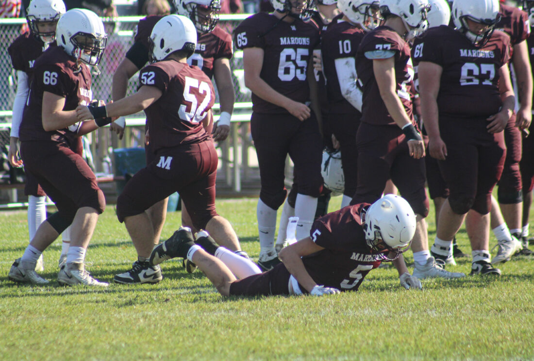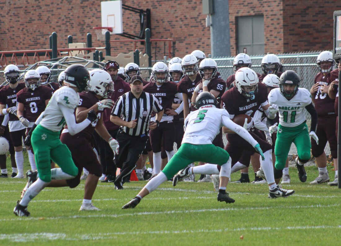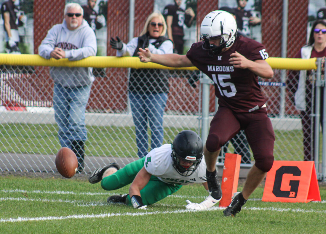 Menominee junior Clayton Miller (15) prepares to jump on a fumble during a MHSAA Division 7 district semifinal game against Houghton Lake on Nov. 2, 2024 at Walton Blesch Field in Menominee. (“The Big Dog” Mitch Vosburg/Daily Press)
