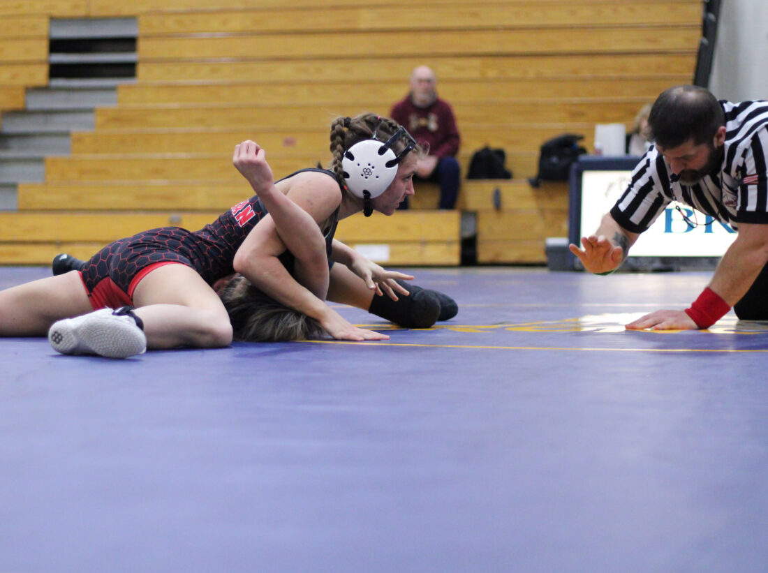 North Central senior Madalynn Corrigan earns a pinfall victory during team district action on Feb. 6, 2025 at Bark River-Harris High School.