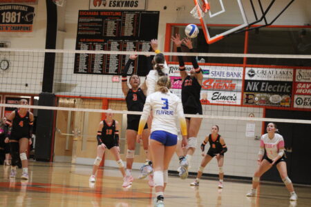 Menominee took a 21-19 lead in the fourth set when senior Jazmine Jasenovsky blocked a shot by Esky senior Ava Stahlboerger.