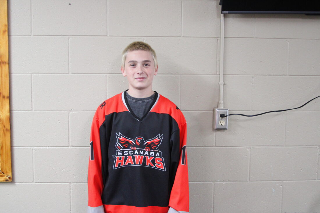 Escanaba Hawks player Remington Vitale poses for a photo on Oct. 20, 2025 at the Hannahville Ice and Turf Complex. (Adam Hinch/Daily Press)