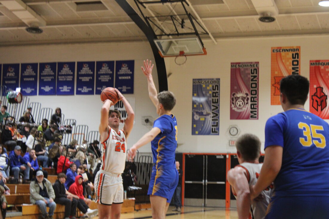 Escanaba senior Lennox Peacock attempts a shot against Kingsford on Dec. 17, 2025 at Escanaba High School. (Adam Hinch/Daily Press)