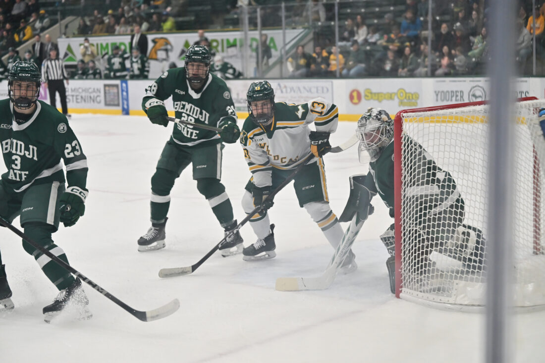 Northern Michigan University’s Medrick Bolduc, second from right, gets into position in front of the Bemidji State net before taking a pass from a teammate he isn’t able to connect with during their CCHA hockey game played at the Berry Events Center in Marquette on Friday, Jan. 30, 2026. (Photo courtesy Cara Kamps)