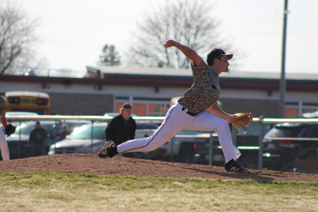 Escanaba senior Cannon Arnt delivers a pitch against Gladstone on April 21, 2026 at Al Ness Field. (Adam Hinch/Daily Press)