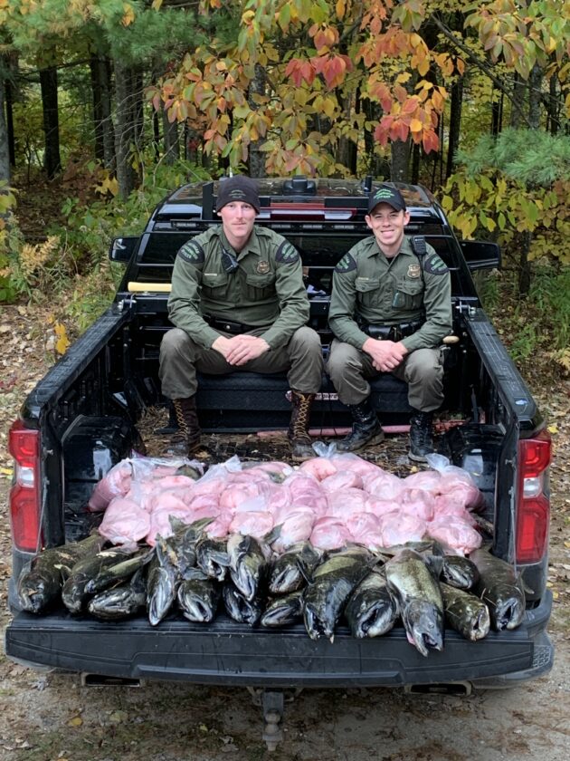 This undated photo shows Michigan Department of Natural Resources (MDNR) Conservation Officers Scott MacNeill (left) and Josiah Killingbeck (right) after having retrieved 463 pounds of salmon from a group of people illegally fishing the Manistee River. The officers donated the fish to local Manistee County families the same day. (Photo courtesy of the MDNR)