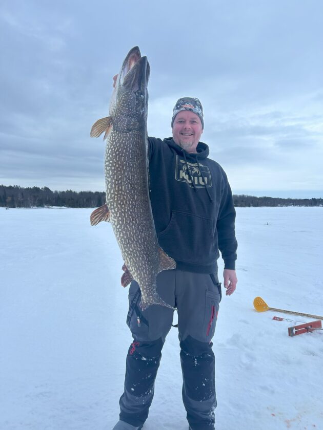 On Tuesday, Seth Pearson, age 44, of Webster, Wis. pulled a 43.5-inch-long northern pike (Esox lucius) from beneath the ice on the northern part of the bay near Vagabond Resort, which is located on the Stonington Peninsula about five miles south of Rapid River.