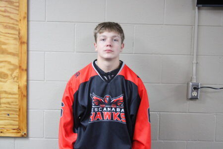 Escanaba Hawks forward Garrett Lanaville poses for a photo on Oct. 20, 2025 at the Hannahville Ice & Turf. (Adam Hinch/Daily Press)