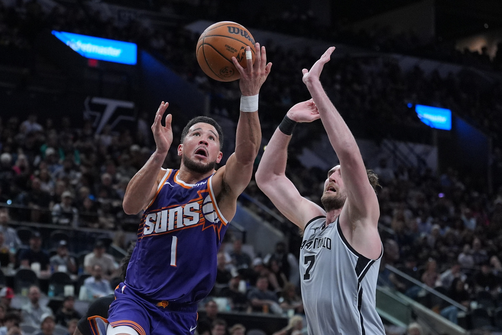 Phoenix Suns guard Devin Booker (1) drives against San Antonio Spurs center Luke Kornet (7) during the first half of an NBA basketball game in San Antonio, Thursday, March 19, 2026. (AP Photo/Eric Gay)